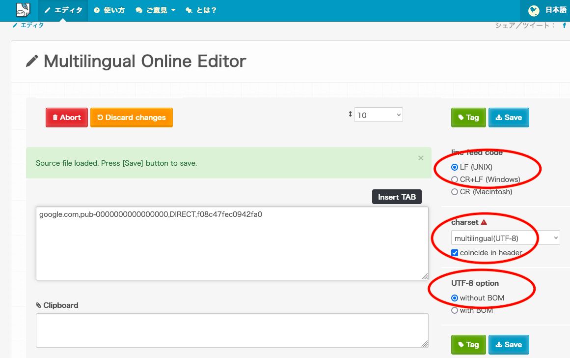 それでは、BOMなしのファイルをオンラインエディターで作成しましょう。以下のURLにアクセスします。